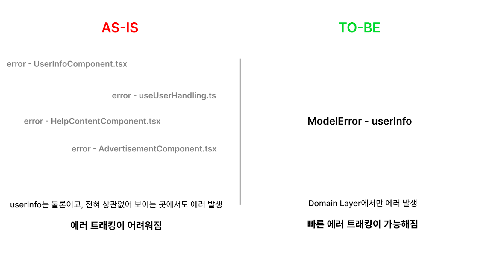 서비스를 운영하다 보면 다양한 에러를 마주하게 됩니다. 그러나 모호하게 얽혀 있는 코드 구조 속에서, 해당 에러가 UI의 문제인지, API 응답 문제인지, 혹은 데이터 가공 중 발생한 문제인지 빠르게 판단하기 어렵습니다. VoC(고객의 소리) 대응에는 속도가 굉장히 중요하기 때문에 이는 치명적인 단점이었습니다.