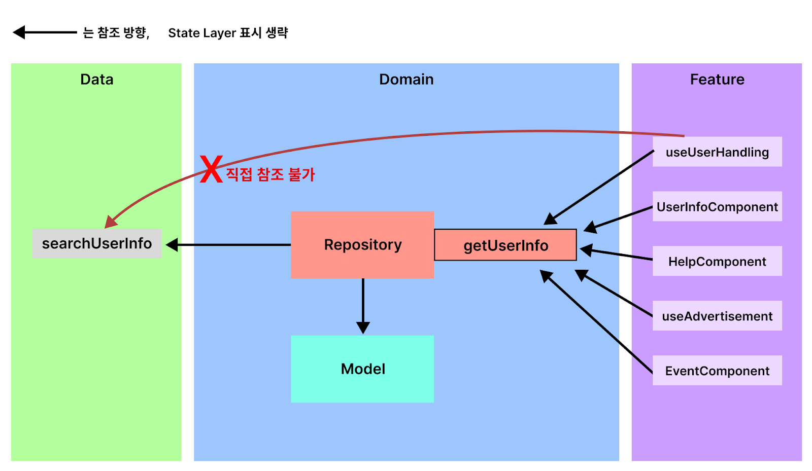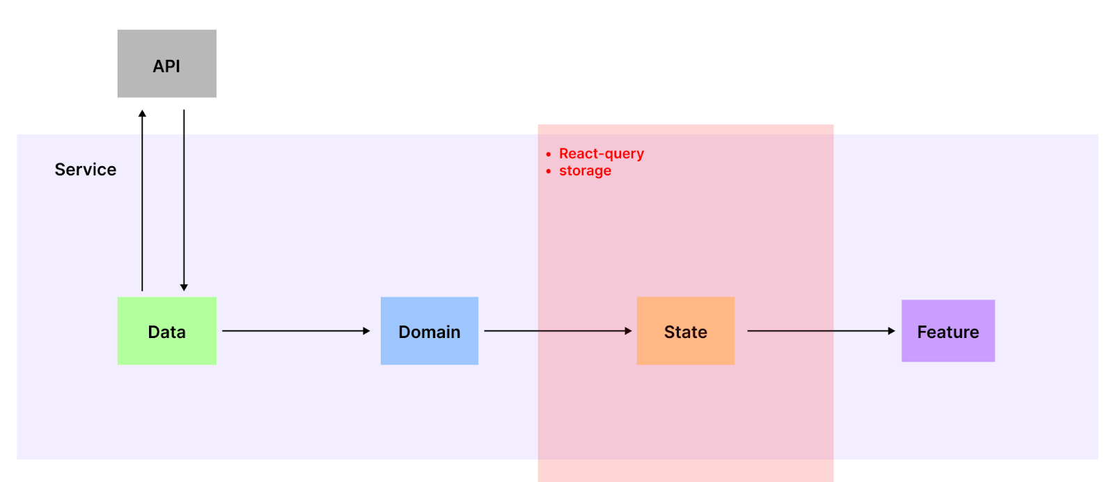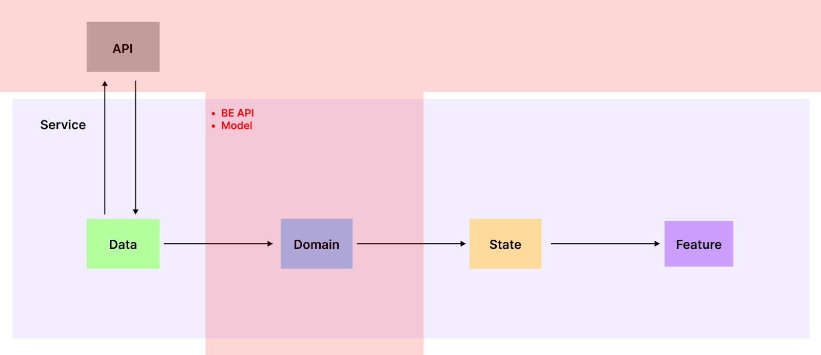 계층은 하나의 Service 내 Data, Domain, State, Feature 4개로 구분됩니다.