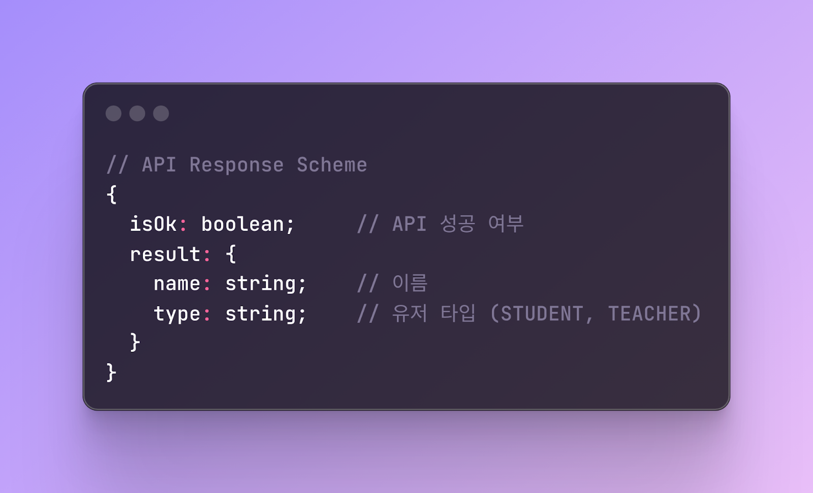 API의 Response Scheme를 보면 이름과 타입을 string으로 내려주고 있습니다. type이라는 데이터는 서비스 전반의 위치에서 사용중이며, type에 따라 동작이 달라지거나 UI가 변경되기도 합니다. 백엔드 개발자와 소통하여 이 타입은 STUDENT와 TEACHER 두 가지의 타입이 존재하는 걸 확인해 두었습니다. 이를 실제 코드로 보자면 아래와 같습니다.