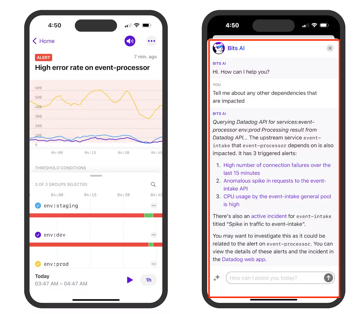 가장 인상깊었던 기능은 Bits AI(Beta) 서비스로 데이터독 내에서 컨텍스트 전환을 통해 Event Tracing 을 하는 것이 아닌 대화형 언어를 통해 원하는 정보를 얻을 수 있는 기능이었습니다.