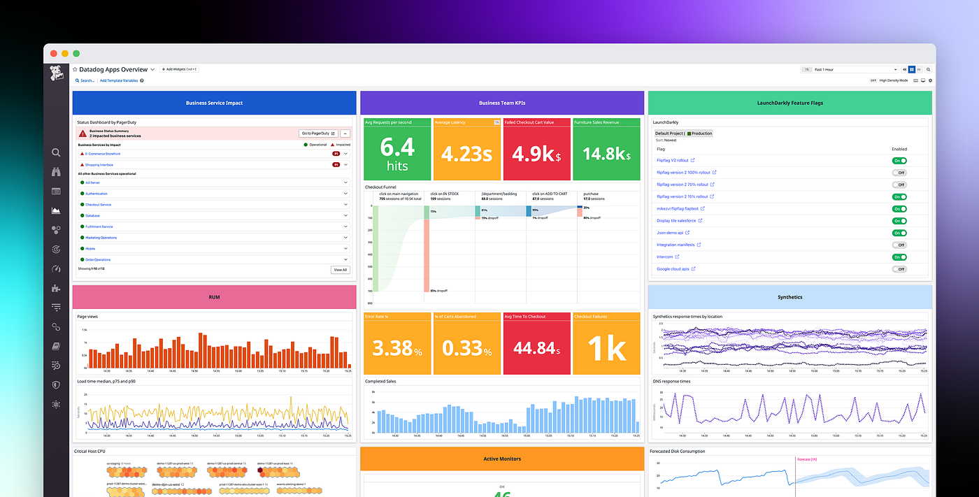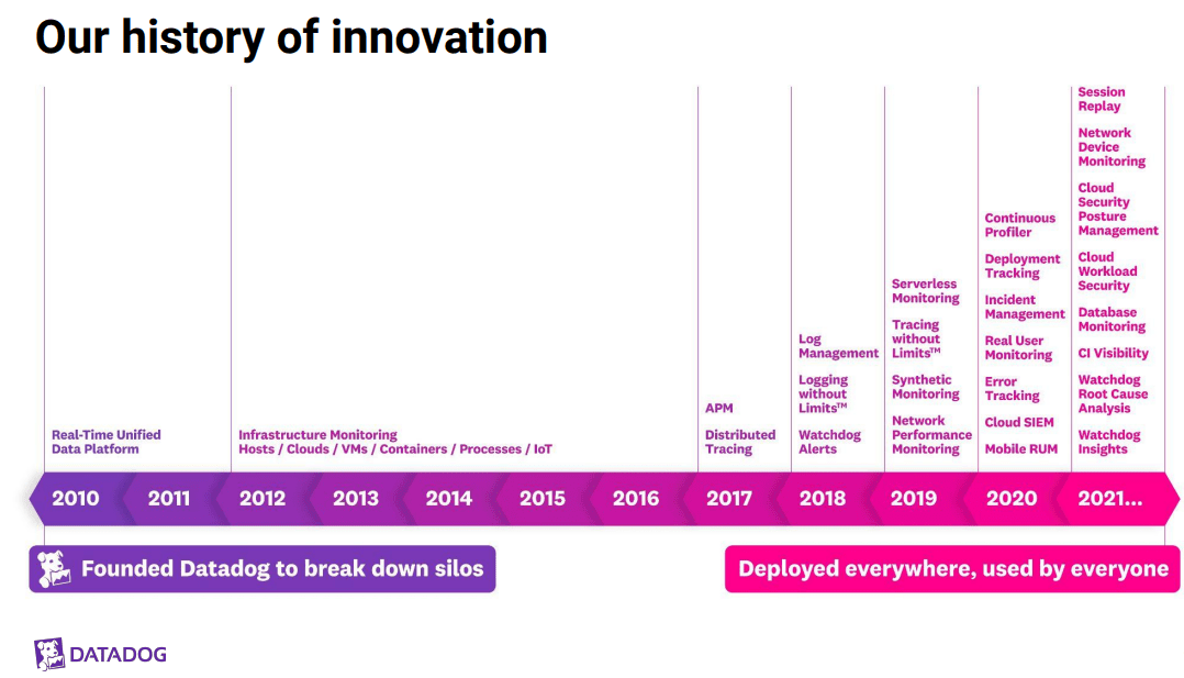 데이터독은 인프라 모니터링을 시작으로 다양한 퍼블릭 클라우드와의 통합 기능 제공, Alarm, Monitor, Dashboard, Logs, DBM(Database Monitoring), APM(Application Performance Monitoring), NPM(Network Performance Monitoring), RUM(Real User Monitoring), Synthetic Test 등 통합 모니터링 서비스로 확장해 나가고 있는 대표적인 모니터링 솔루션입니다.