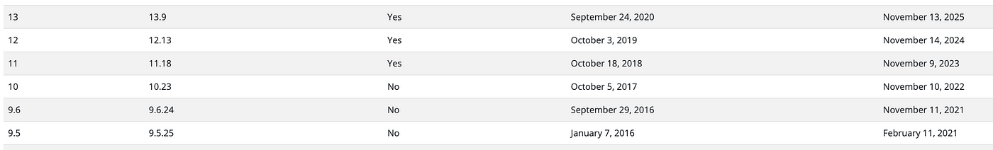 Postgresql 버전 정책 (출처: https://www.postgresql.org/support/versioning/)