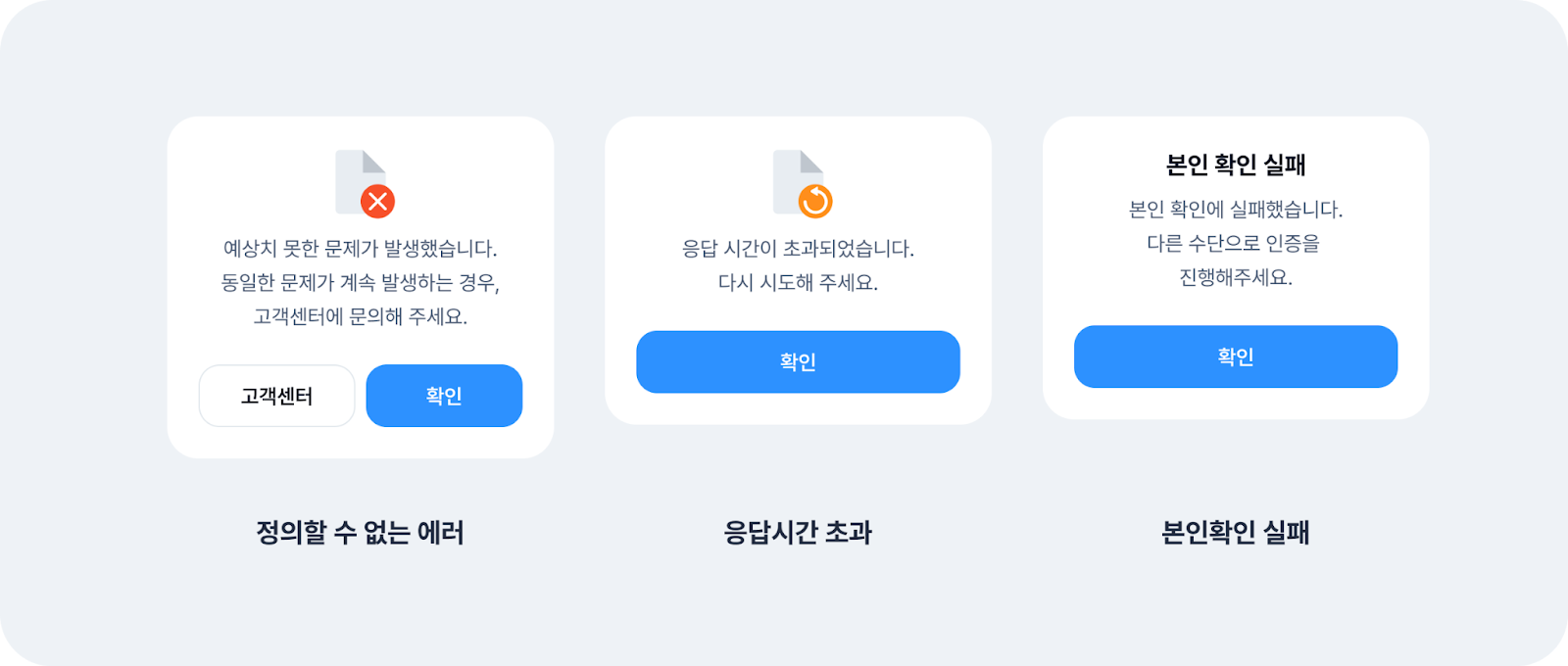 위 이미지와 같이 에러가 발생해도 사용자가 정상적인 플로우로 돌아갈 수 있도록 유도하거나, 해결 방법을 안내했습니다.