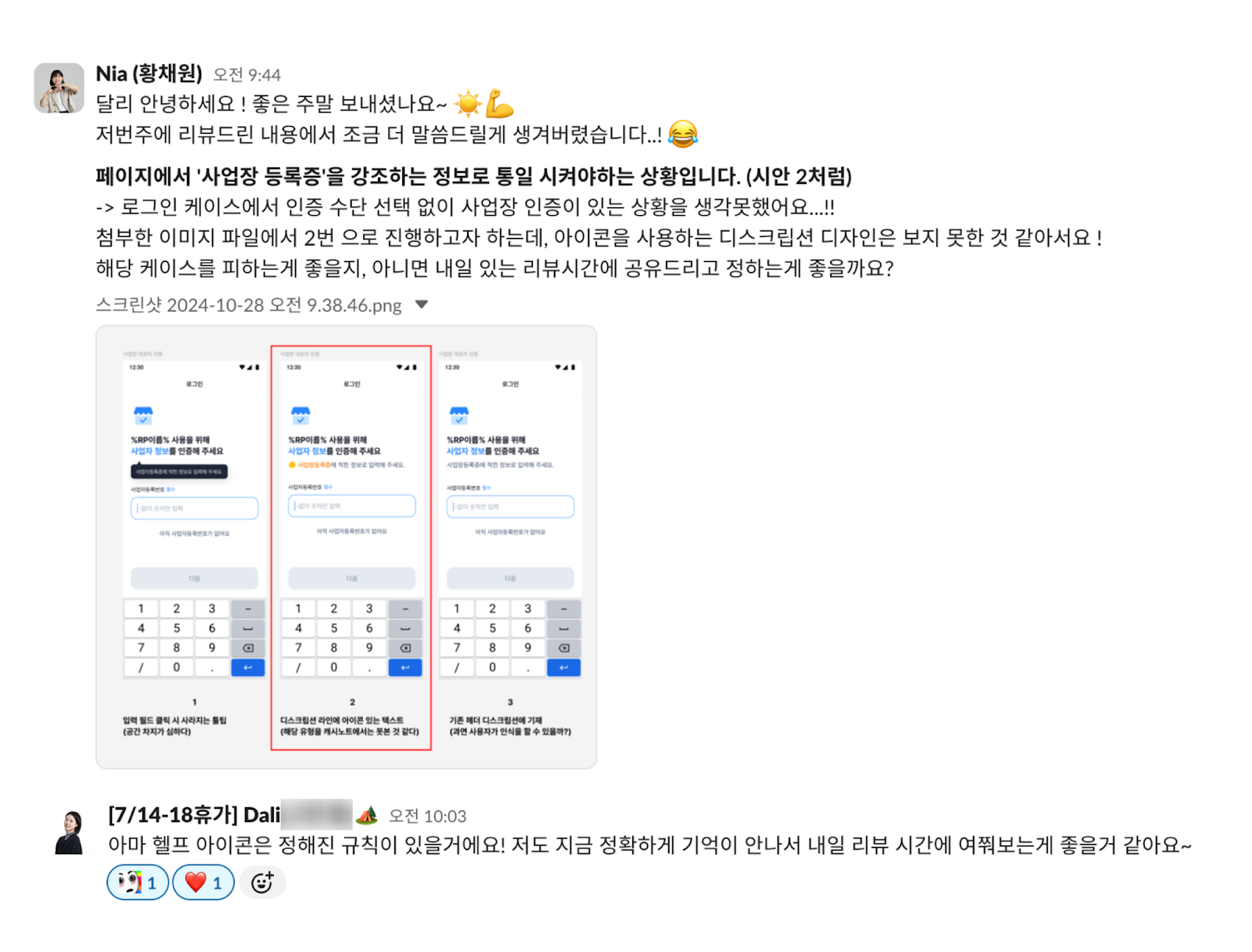 그리고 KCD에는 매주 디자이너들이 모여서 디자인 결과물에 대한 리뷰를 진행하는데 이때 디자인 시안을 들고가서 다른 분들의 피드백을 들을 수 있었던 점도 큰 도움이 되었습니다.