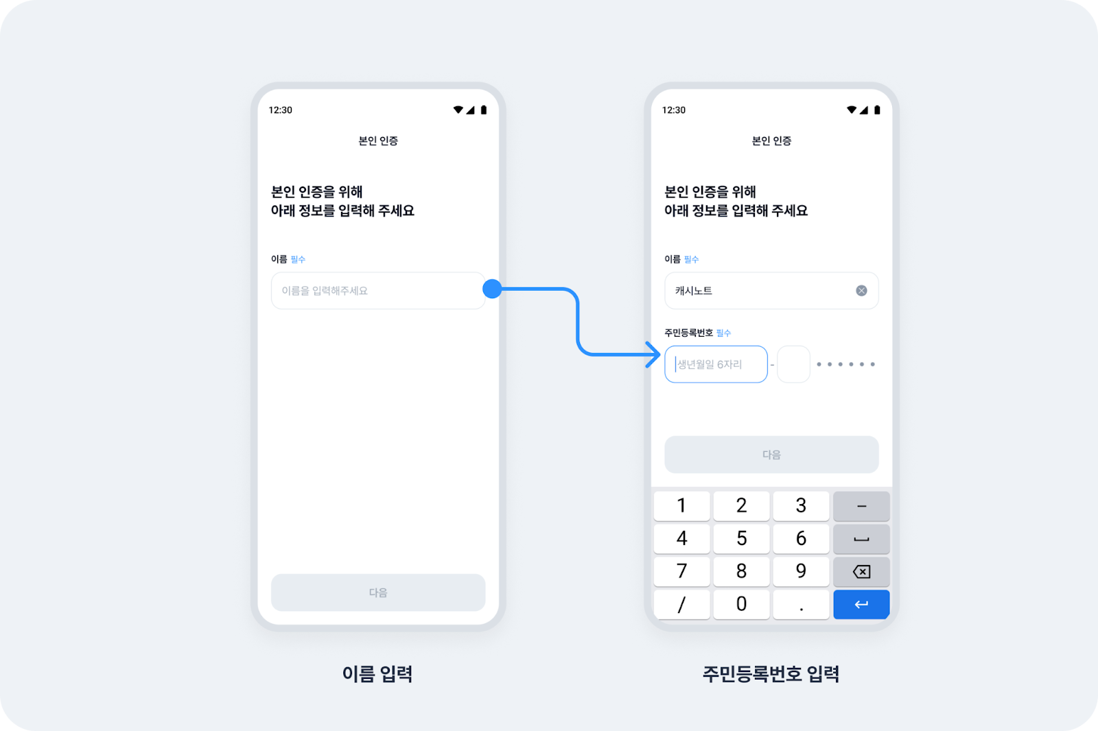 이에 따라 사용자가 한 번에 모든 정보를 입력하기보다는, 지금 당장 필요한 정보 하나씩만 입력할 수 있도록 입력 칸이 순서대로 나타나는 방식으로 설계했습니다. 이렇게 함으로써 사용자가 입력 과정에서 느끼는 부담을 줄여, 본인인증을 성공할 수 있도록 했습니다.