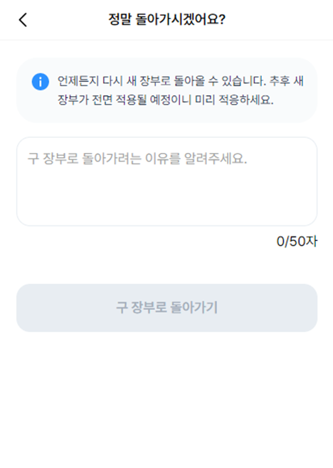 신규 가입 이용자는 개편된 새로운 장부만 보도록 하고, 나머지 기존 방식에 익숙해진 이용자들은 자유롭게 전환 가능하게 했습니다. 그리고 신 장부에서 다시 구 장부로 넘어갈 때는 반드시 피드백을 남기도록 했습니다.