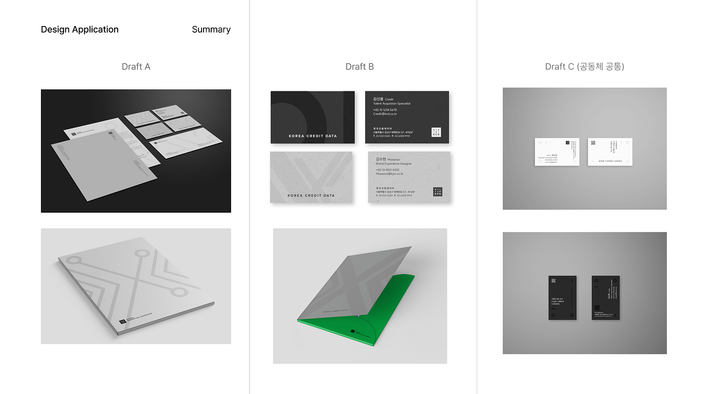 Jia: 세 가지 시안 중 패턴 시스템과 컬러 시스템이 확정되자마자 실제 어플리케이션들을 제작할 소재(종이)를 보러 두성종이 페이퍼 뮤지엄에 갔습니다. 다양한 종이들을 실제로 보고 만져보며 적합한 종이를 찾고, 한동안 바삐 달려온 우리 팀이 오래간만에 리프레시 하는 경험이기도 했습니다. 수많은 회색 지류 중에서 명함과 봉투에 적합한 컬러와 무게 값을 가진 종이를 고르느라 마지막까지 많은 고민을 했던 기억이 납니다.