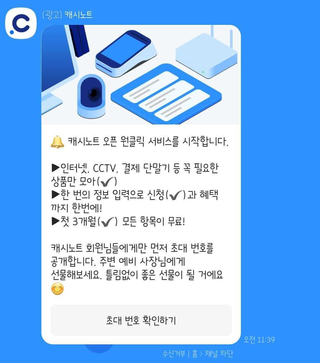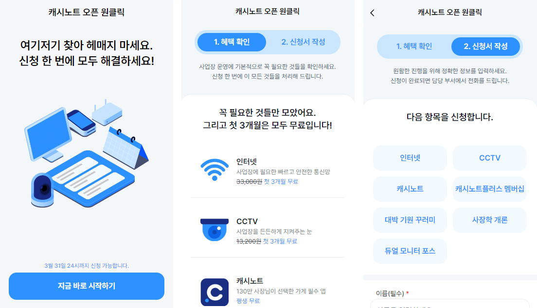 캐시노트 오픈 원클릭은 사업장 오픈을 준비하는 예비 사장님들의 필수 인프라 고민을 획기적으로 덜어드리는 서비스입니다. 업종 상관없이 필수인 인터넷/CCTV/결제 수단(카드 단말기 or POS)에 더해 캐시노트플러스 멤버십과 다른 선물들까지, 신청 한 번에 모두 해결할 수 있습니다. 첫 3개월 무료 혜택은 덤입니다.