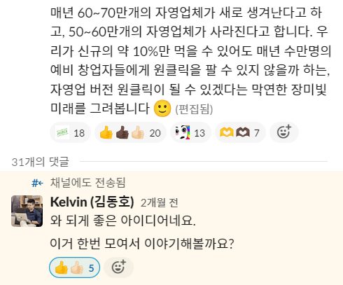 감사하게도 총 50개가 넘는 공감이 달리고, 여러 댓글들이 달리기 시작했습니다. 그리고 결정적으로 2023년 1월 9일에 CEO 켈빈(Kelvin)의 다음 댓글이 달렸습니다. 속도가 붙기 시작했습니다.